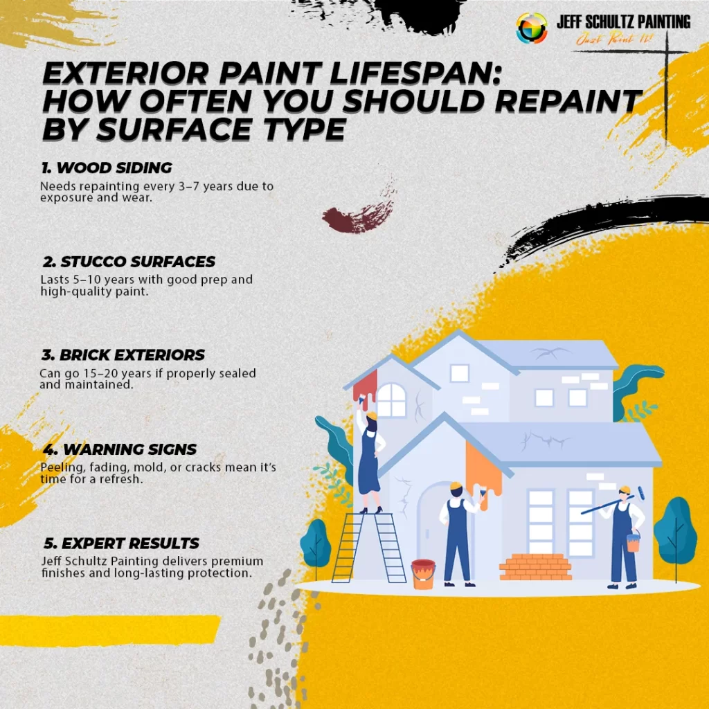 - Stucco: Usually lasts longer, requiring repainting every 5-10 years, depending on the finish.